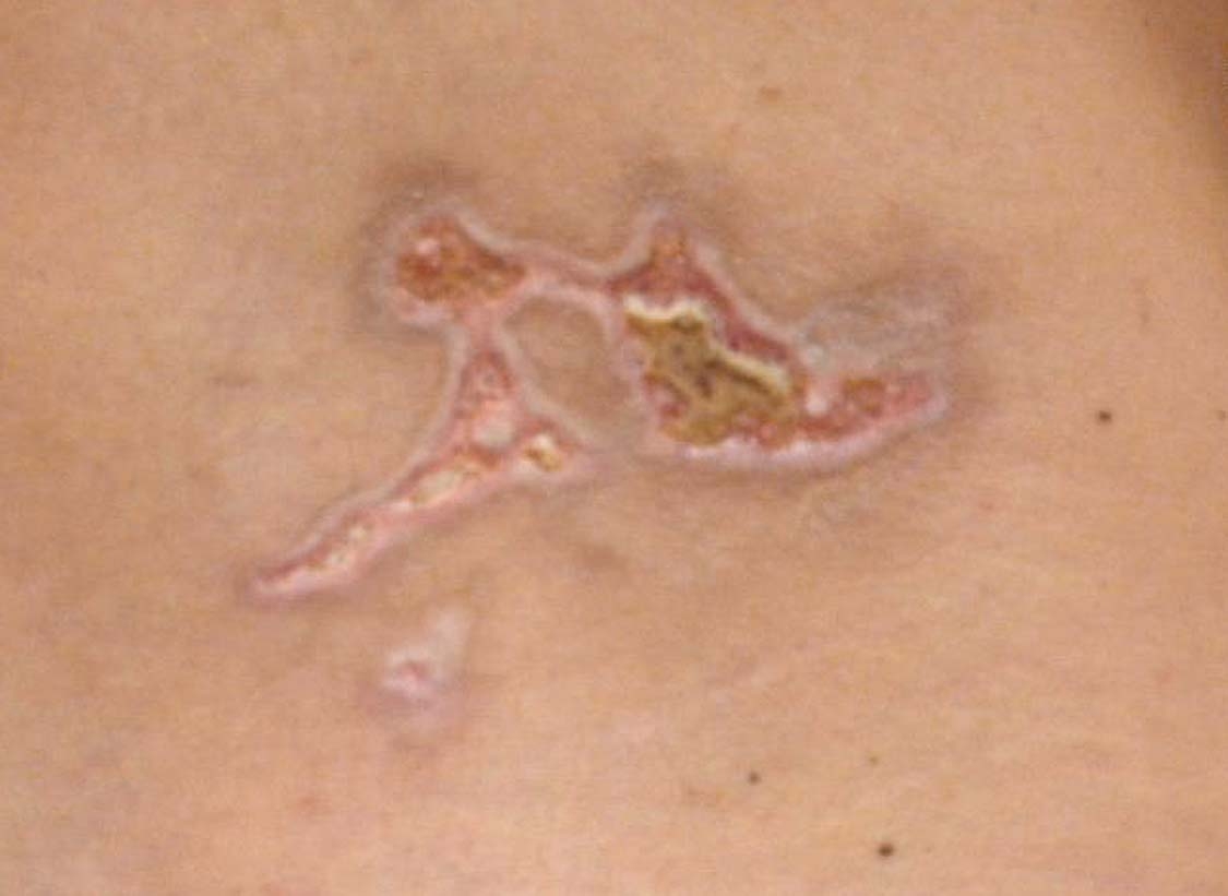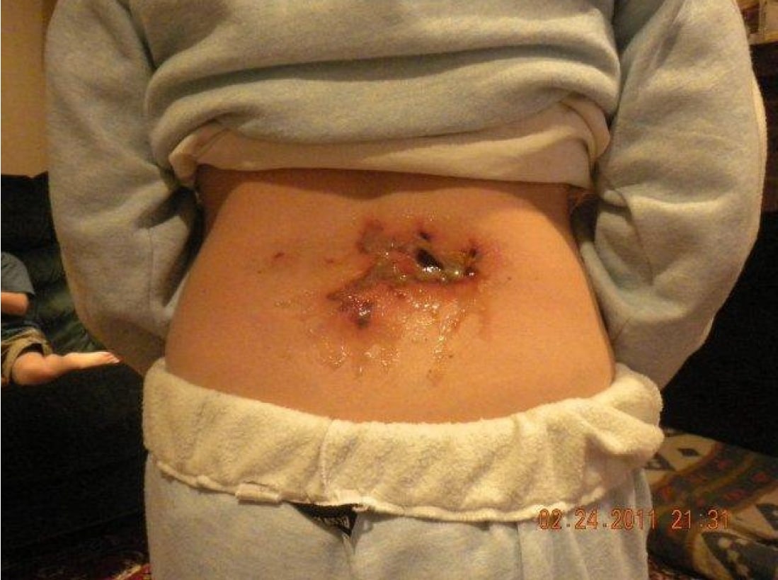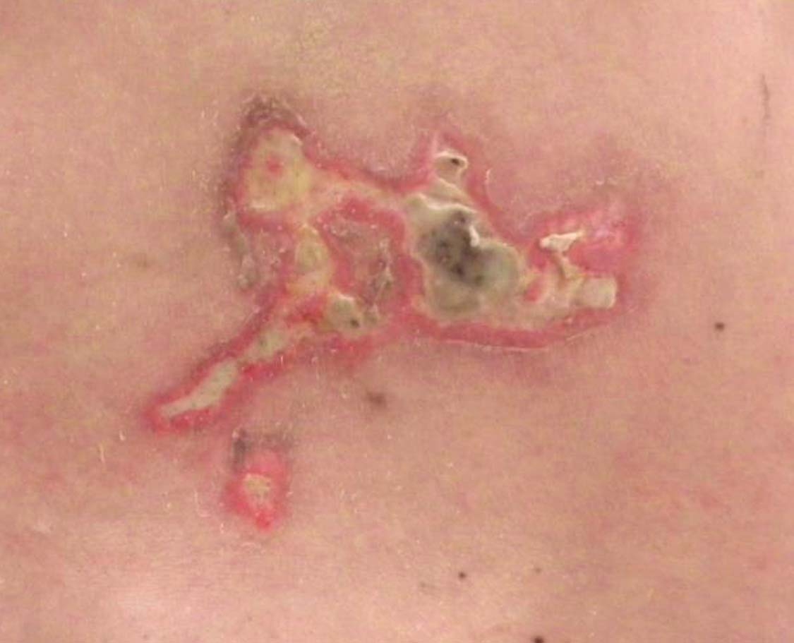 Photo taken 7 days after chemical-detoxification burn appeared with no signs of improvement.