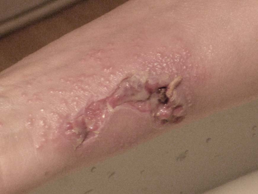 Several days later after photo 2, after soaking the wound in clean water to remove old coconut cream and honey: