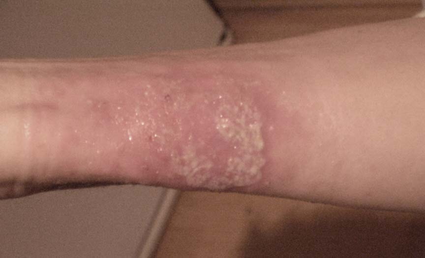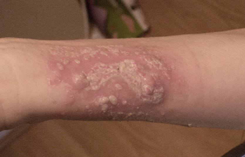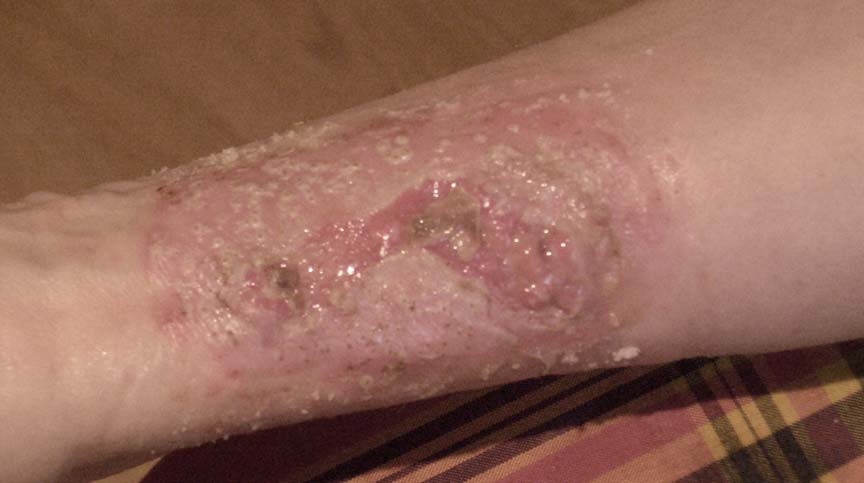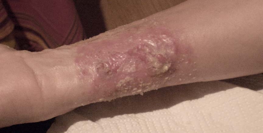 About 2 weeks after inflicted wound. Note that the whitish areas are not puss but caked coconut cream that prevents the skin from drying, scabbing and massive scarring: