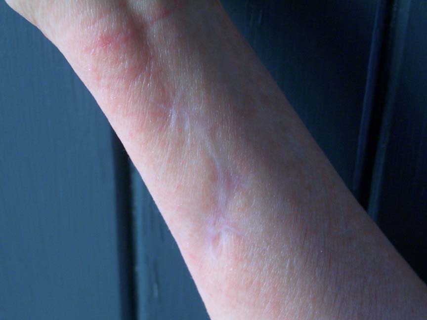 If Sandra had skin grafted, her scars would look like burns with tightly constricted tissue. Such scarring is usually painful throughout life. Also, there would be scarring on areas where skin would have been grafted at either buttocks or thighs. As you can see, she has very little scarring.