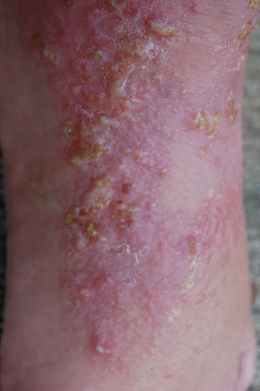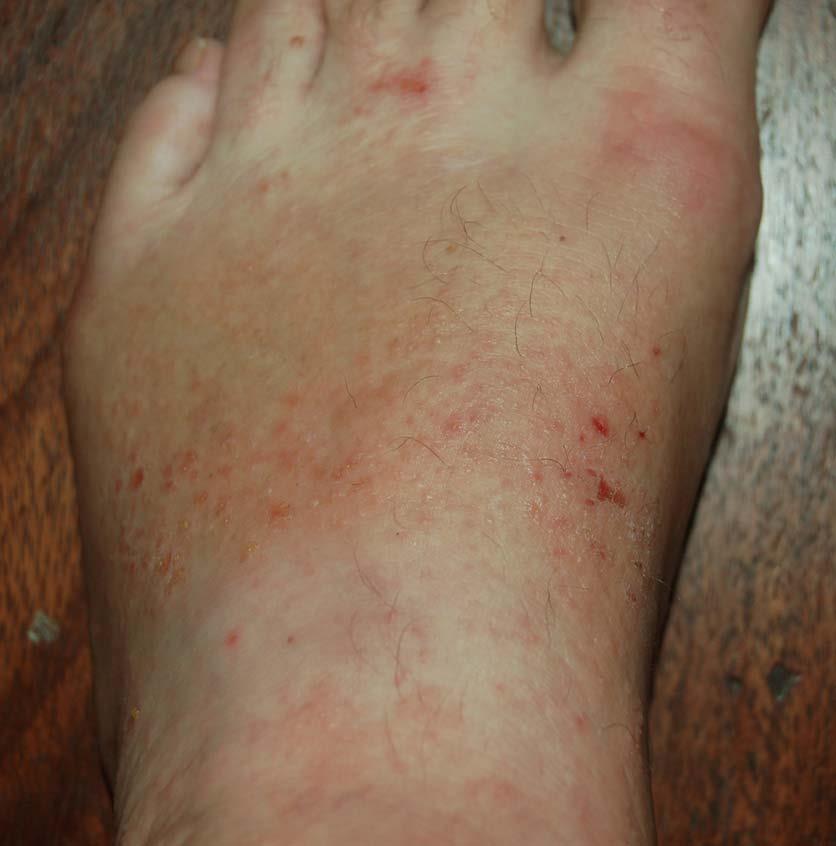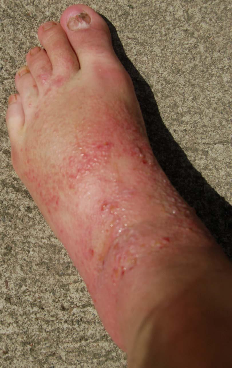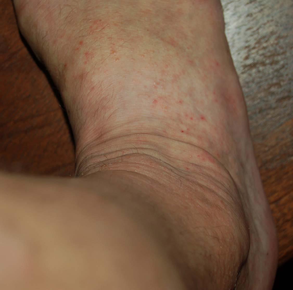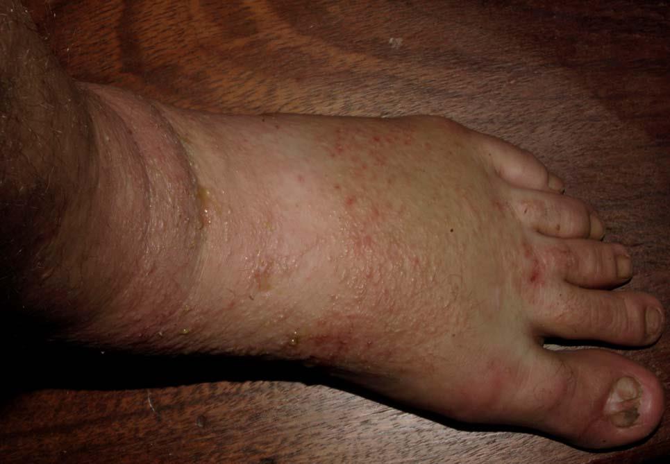 The following 2 photos are from April 17th. Notice how much the rashes are seeping compared to the previous day and how jaundiced the foot is.