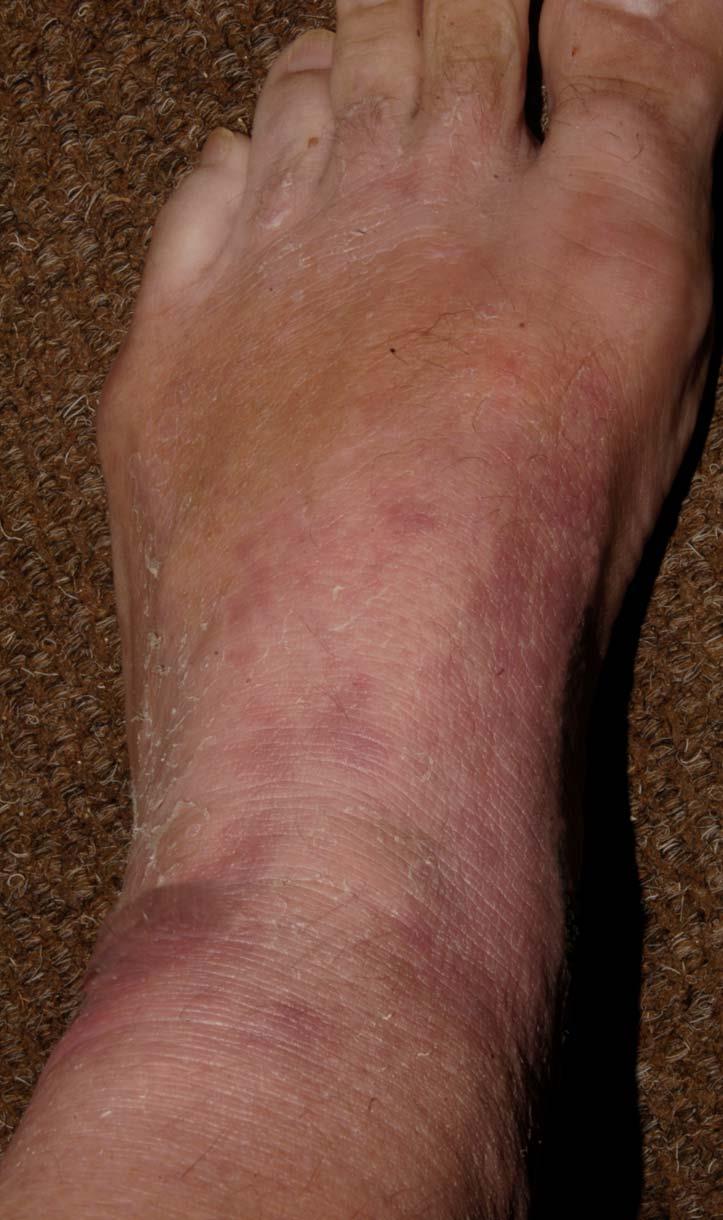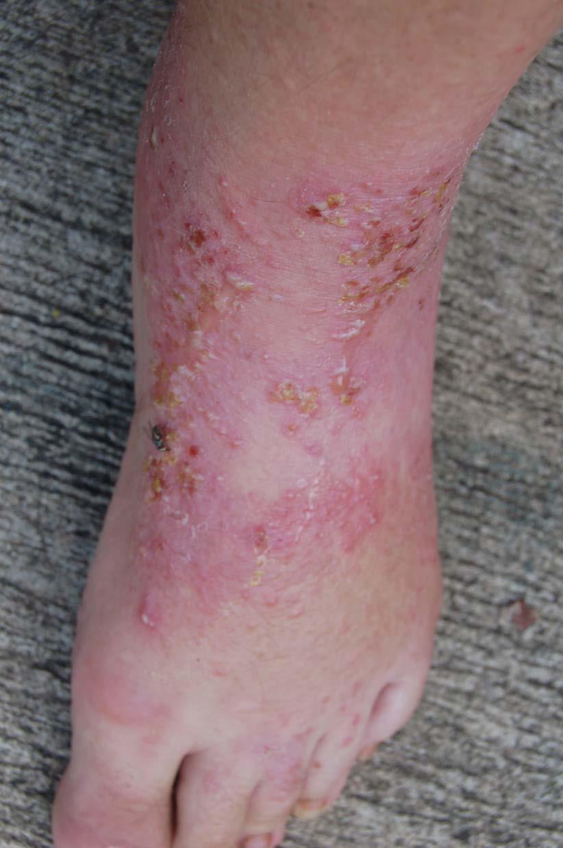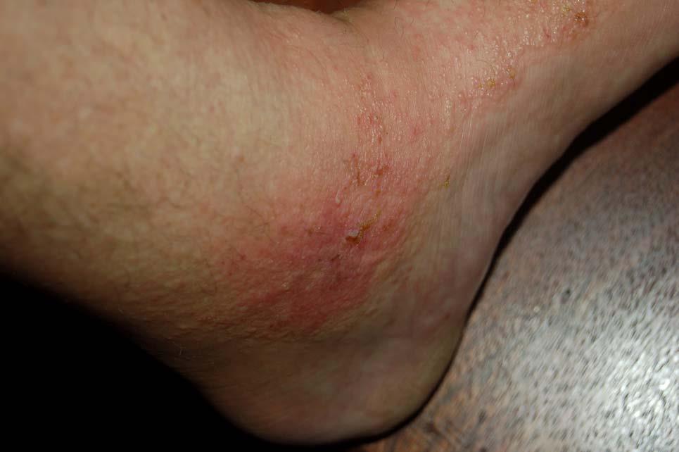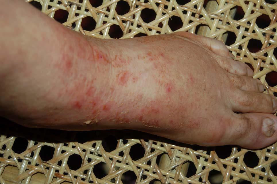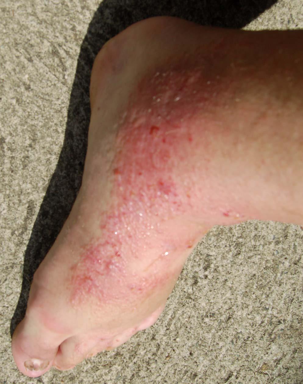 The following 2 photos are from April 17th. Notice how much the rashes are seeping compared to the previous day and how jaundiced the foot is.