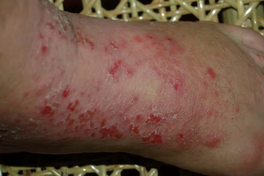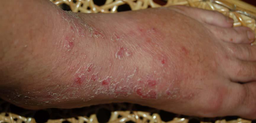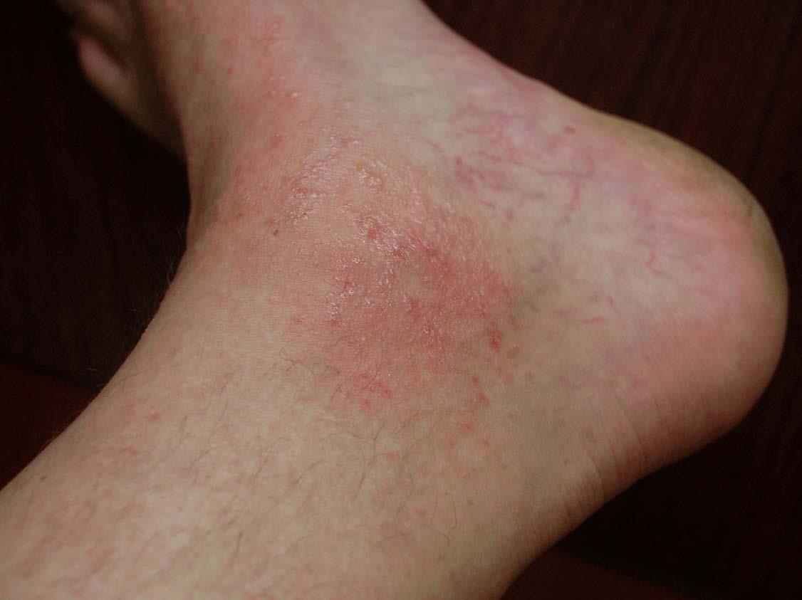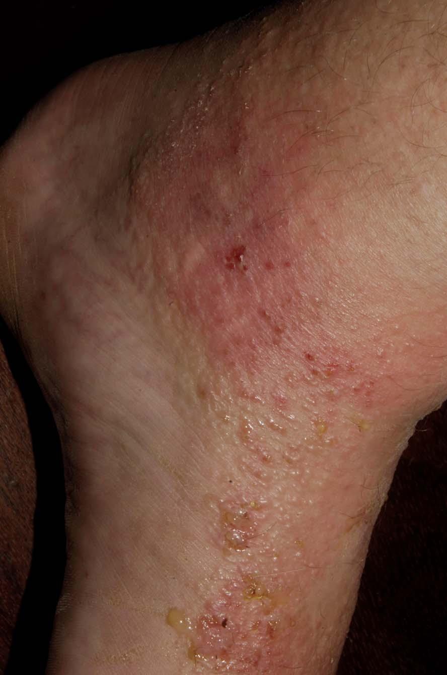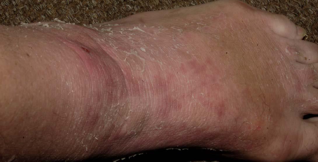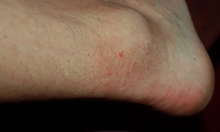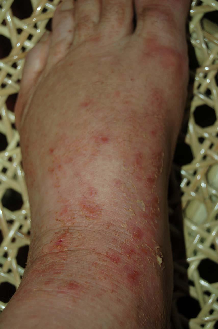 The following 2 photos are from April 17th. Notice how much the rashes are seeping compared to the previous day and how jaundiced the foot is.