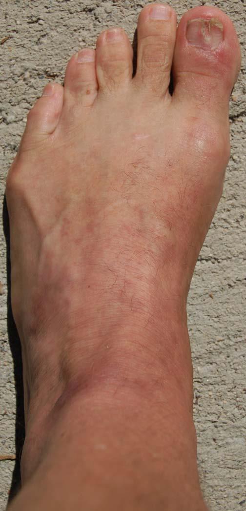 The following 2 photos are from April 18th; the industrial chemicals caused so much irritation and burn to the cells that the skin reddened and foot swelled considerably.