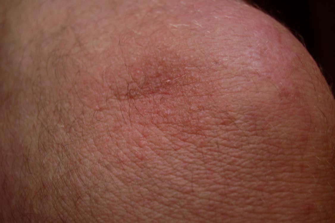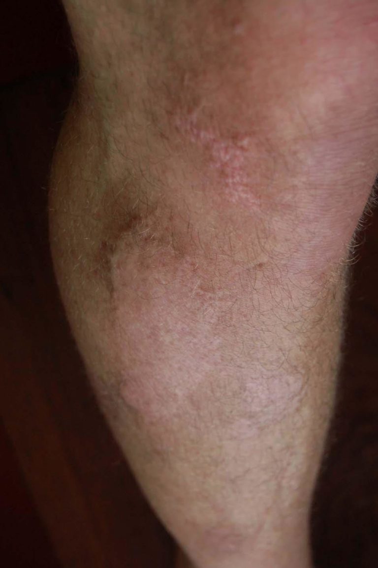 The sores on my neck, arms, shoulders, chest and buttocks were similar to those that occurred on my feet but they were few in comparison. I had one inside my right nostril that continued to seep and bleed from May through August. To save redundancy, I did not photo-record those and display them here except one on my left buttock and one of my right knee. Also, the sores on the rest of my body did not linger as did those on my feet.